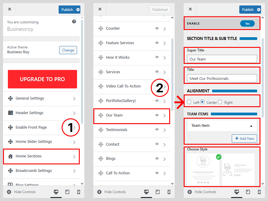- Set ‘Disable Section‘ to ‘No‘ if you wish to disable Team Section on your home page else set the option to ‘Yes’.