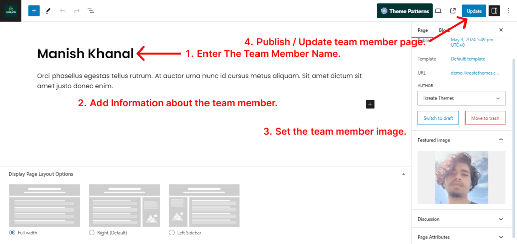 - Select the Team Member page that you’ve created for the Team Member 1 from ‘Select a page’ drop-down page list.