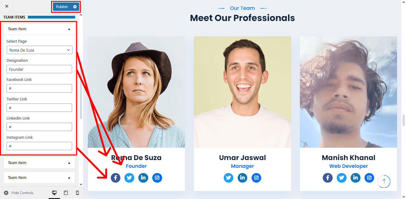 - Set Team Member 1’s Social Profile Link (Facebook, Twitter & Google+ URL).