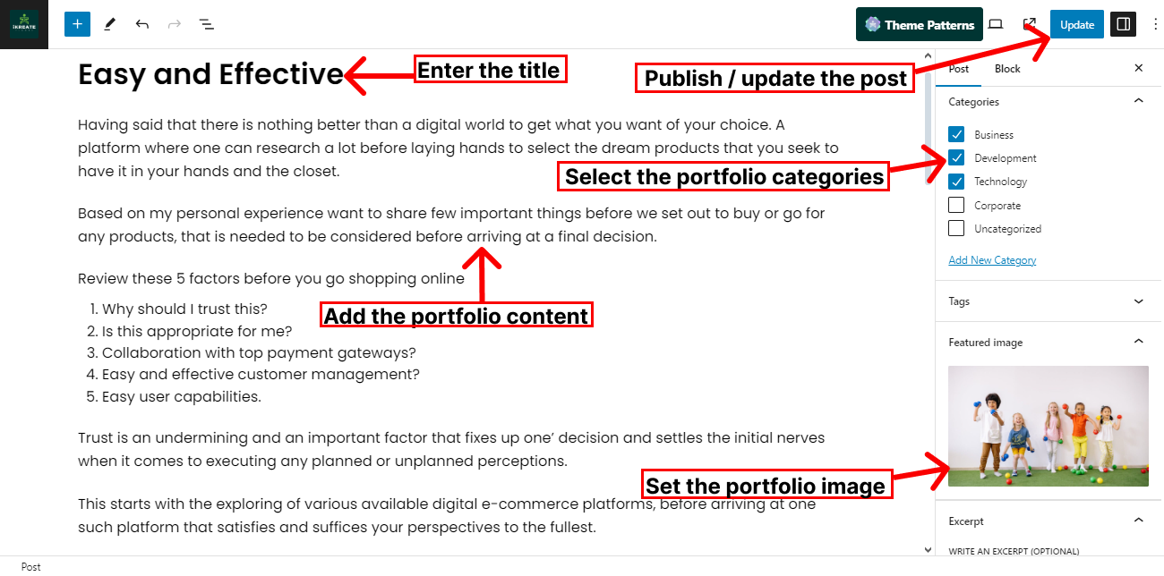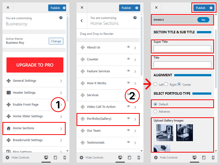 To Create a Portfolio Section You’ll initially need to create the portfolio categories and portfolio posts then later configure to display the portfolio via Customizer.