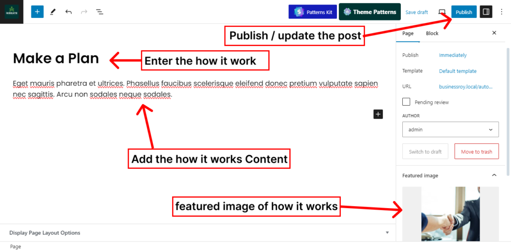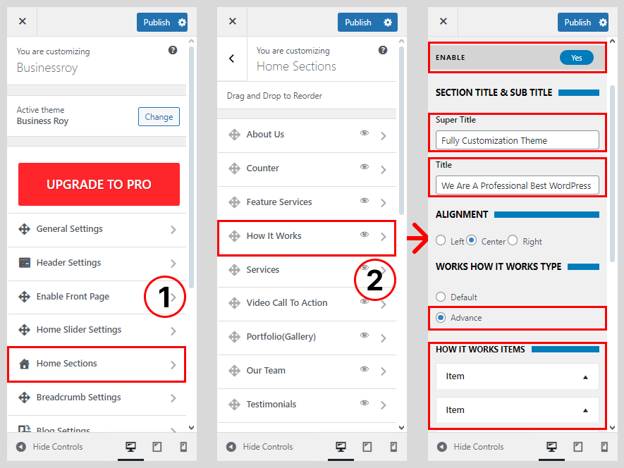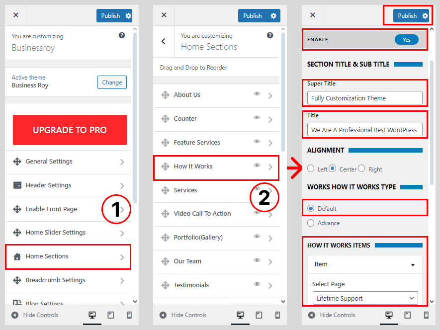 The theme allows you to display 3 step inside the How It Works of home page. To configure the How It Works you’ll have to create How It Works page and later configure it to display it from the customizer.