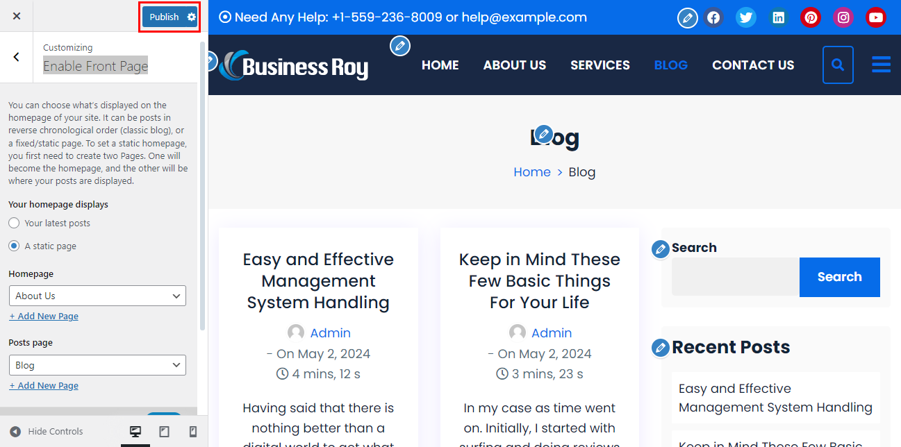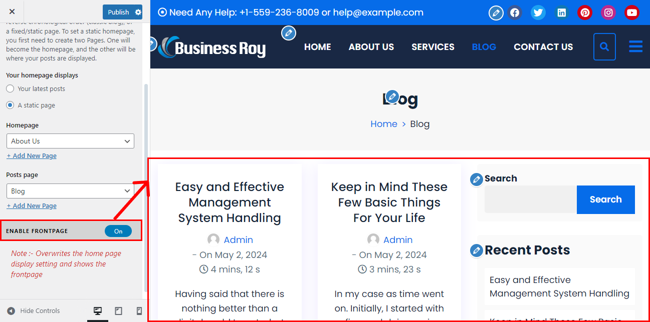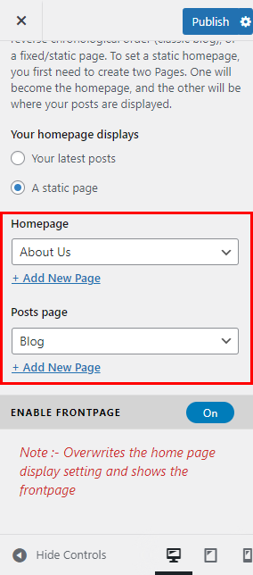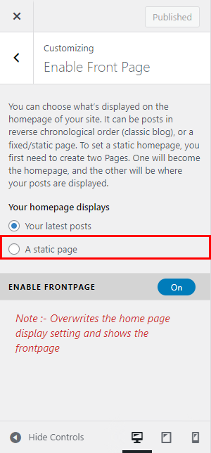 - Go to Appearance > Customizer > Enable Front Page.