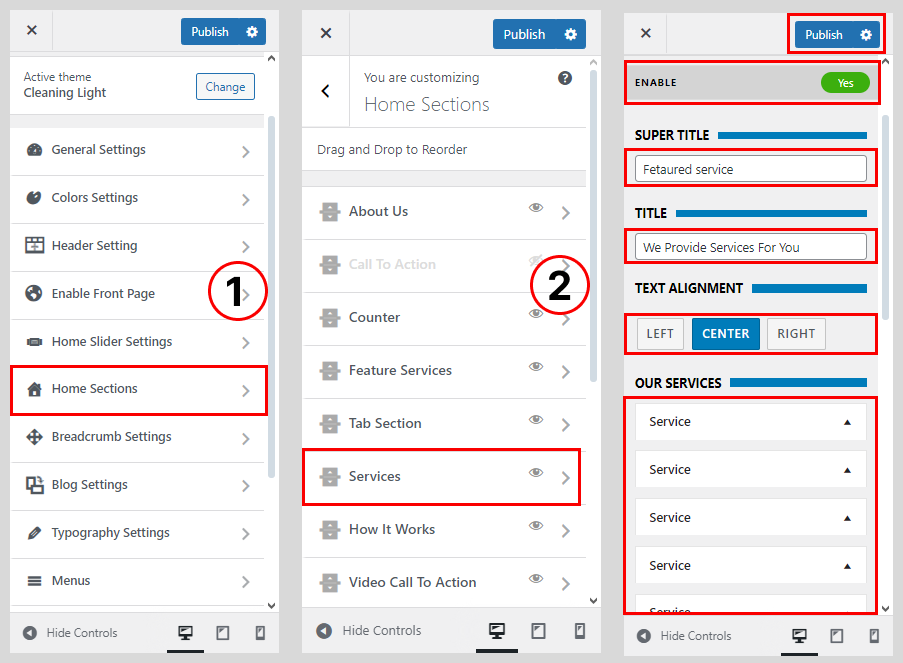 • Go to Home Sections > Service Section