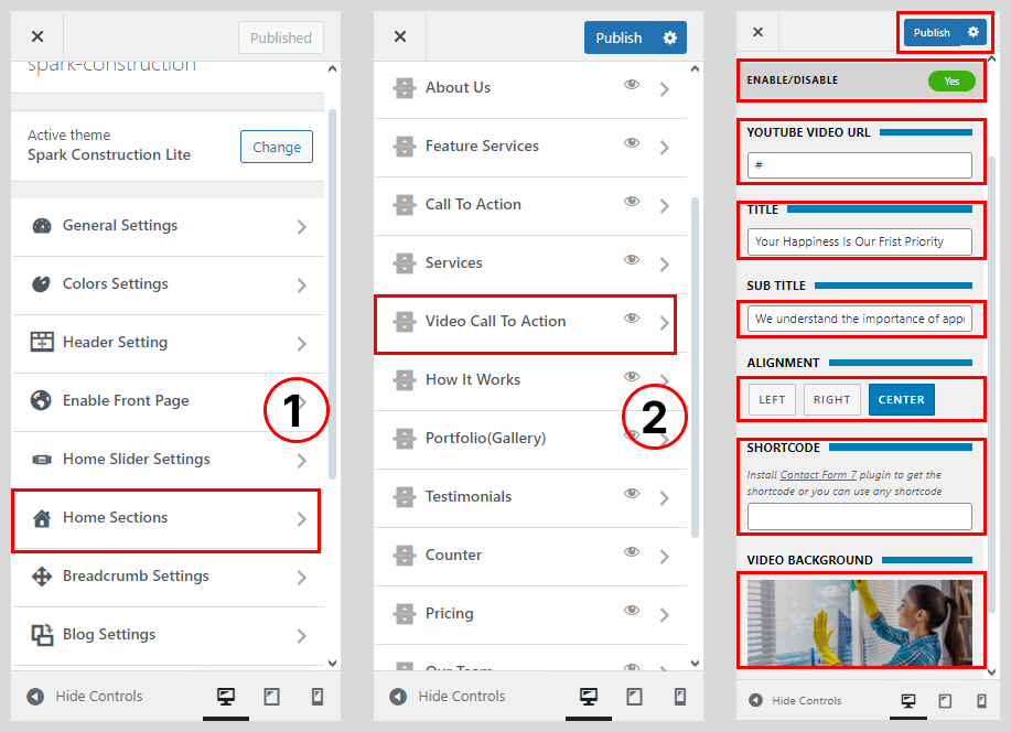 • Set ‘Disable Section’ to ‘No’ if you wish to disable the video call to action section on your home page else set the option to ‘Yes’.