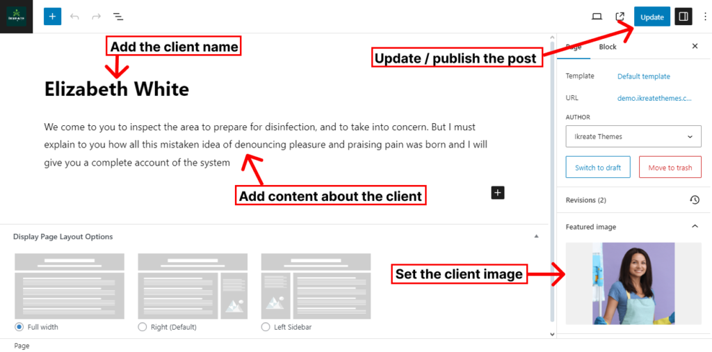 The theme allows you to display unlimited client testimonial inside the Testimonial Section of home page. To configure the Testimonial section you’ll have to create Client Testimonial page and later configure it to display it from the customizer.