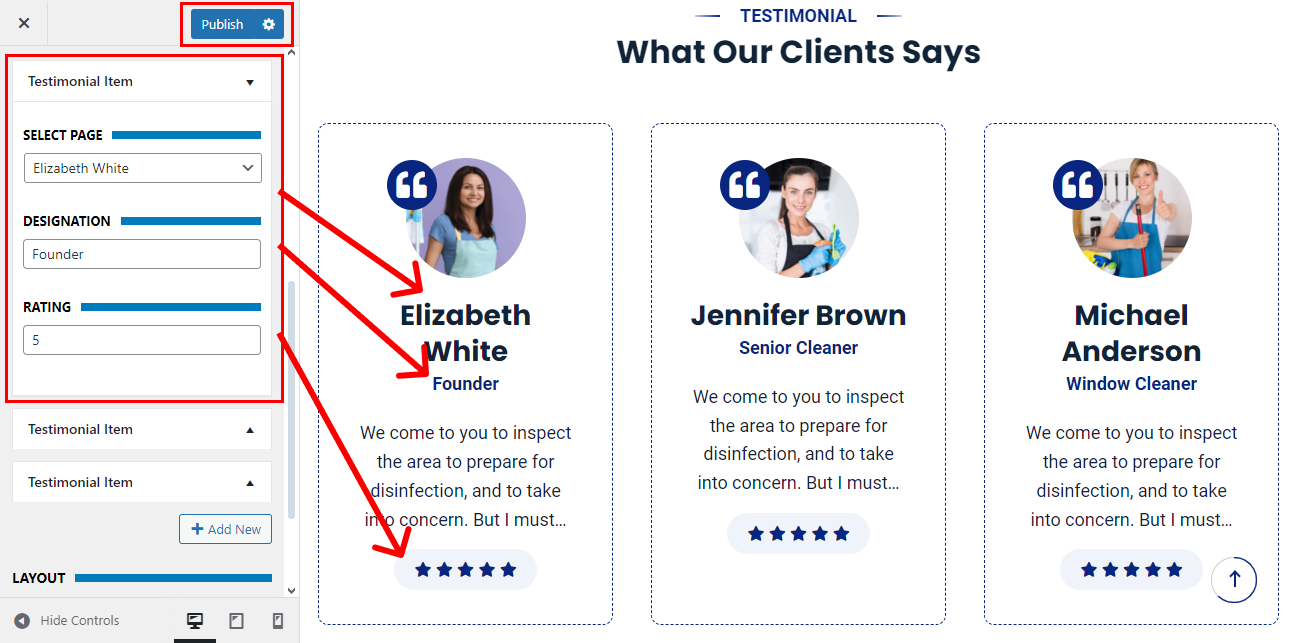 • Set the Testimonial Section title under the ‘Title’ text field.