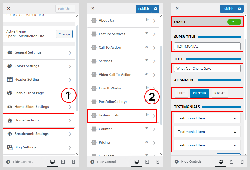 • Set ‘Disable Section‘ to ‘No‘ if you wish to disable Testimonial Section in your home page else set the option to ‘Yes‘.