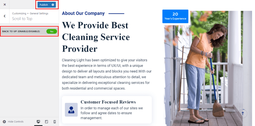 The theme comes with the option to show/hide scroll to top button on your website. The scroll to top button will allow you scroll back your website to its top section by clicking it.