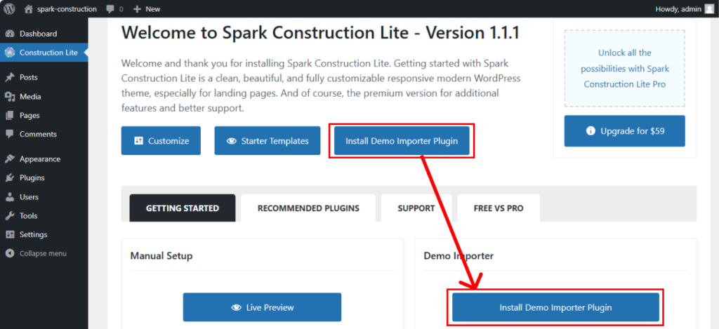 Note: When you ‘click’ on Install Demo Importer Plugin it will be automatically install plugin.