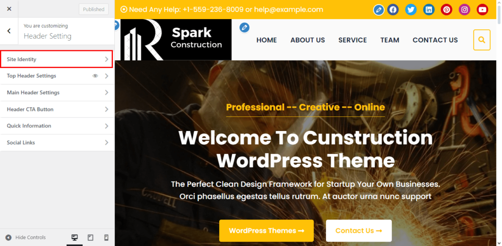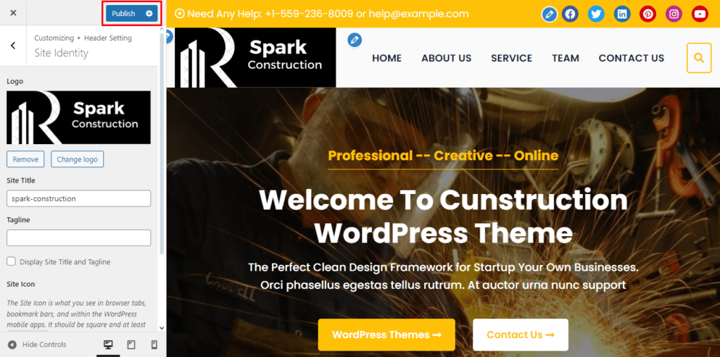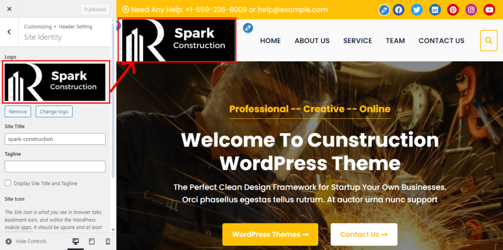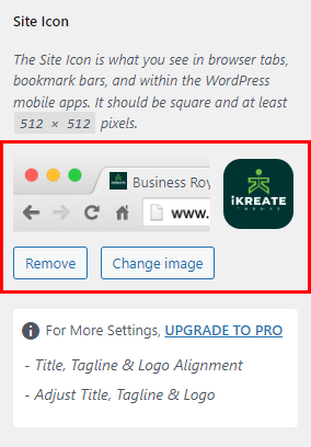 • Upload and select the desired image. (The Site Icon/ favicon is used as a browser and app icon for your site. The recommended Site Icon size is 512 x 512 pixels.)