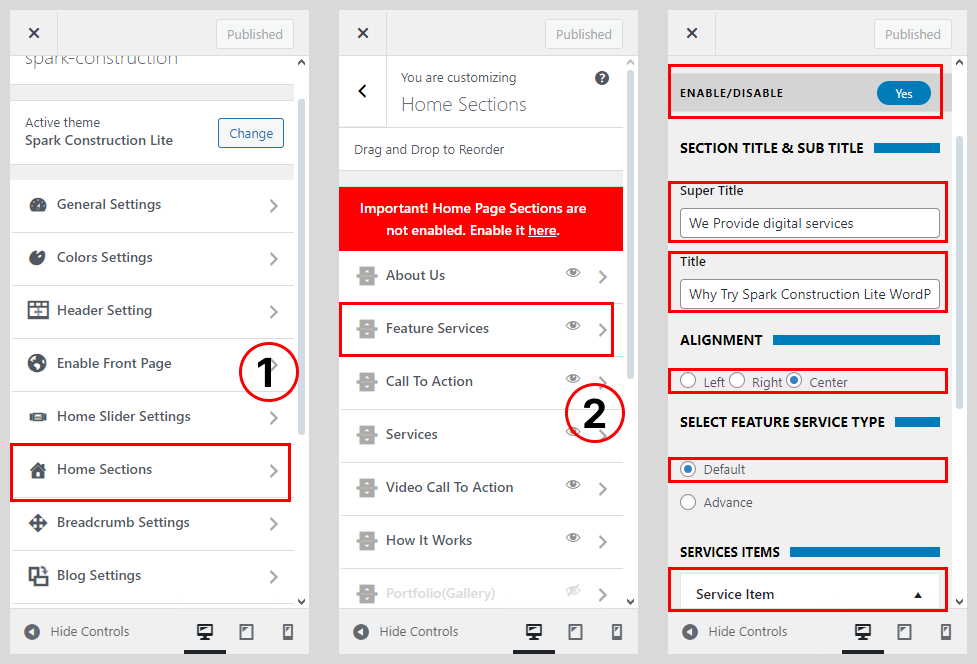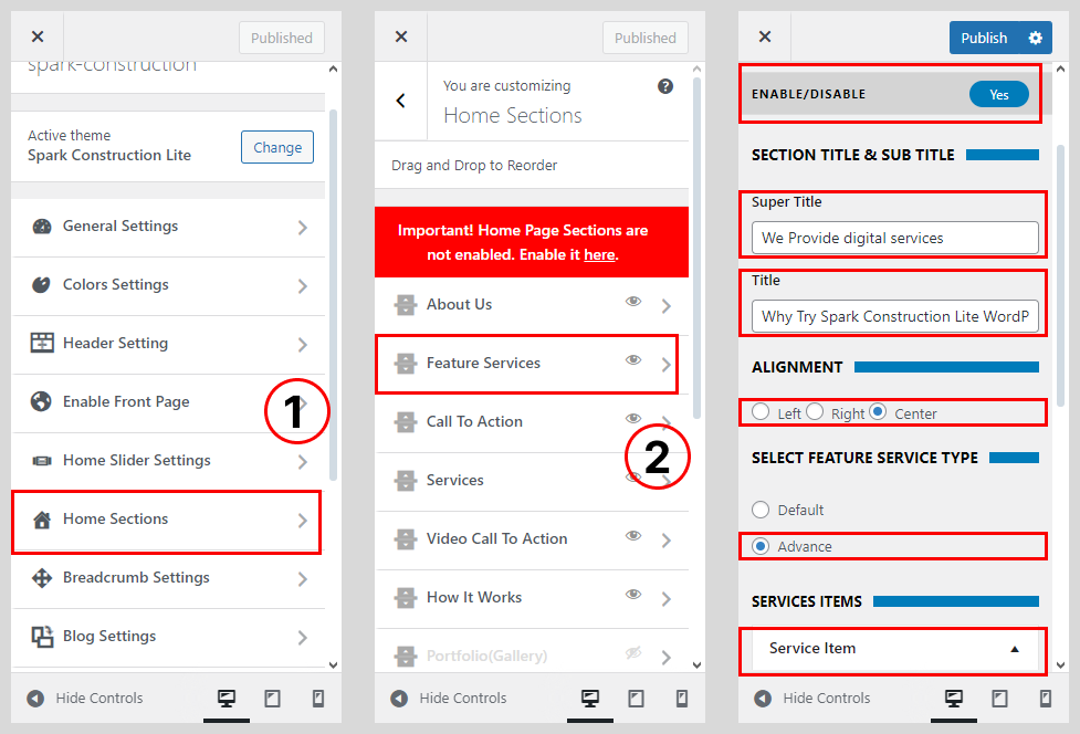 To configure the feature section you’ll have to create feature page and later configure it to display it from the customizer.