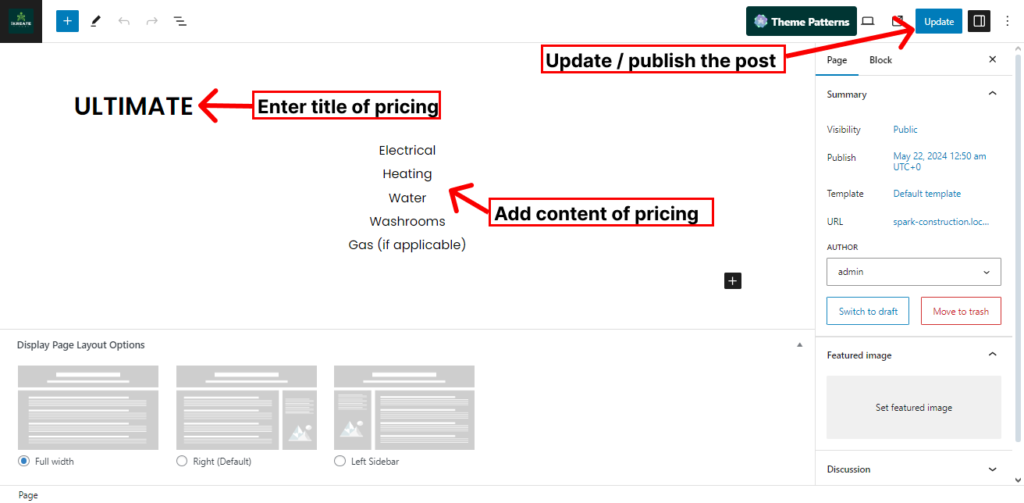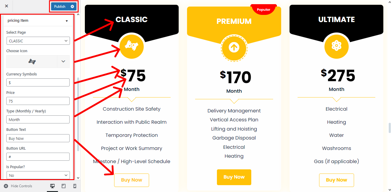 • Set the Pricing Section title under the ‘Title’ text field.
