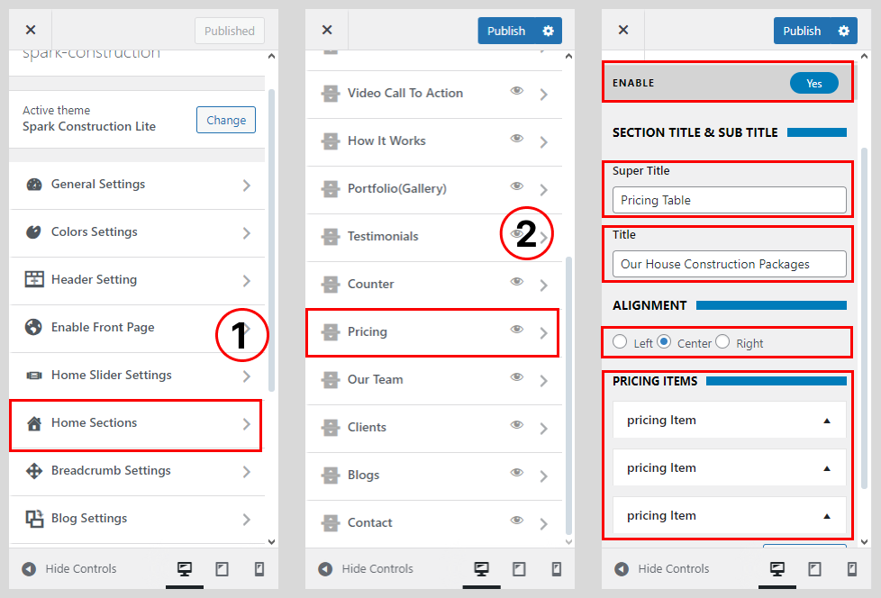• Go to Home Sections > Pricing Section.