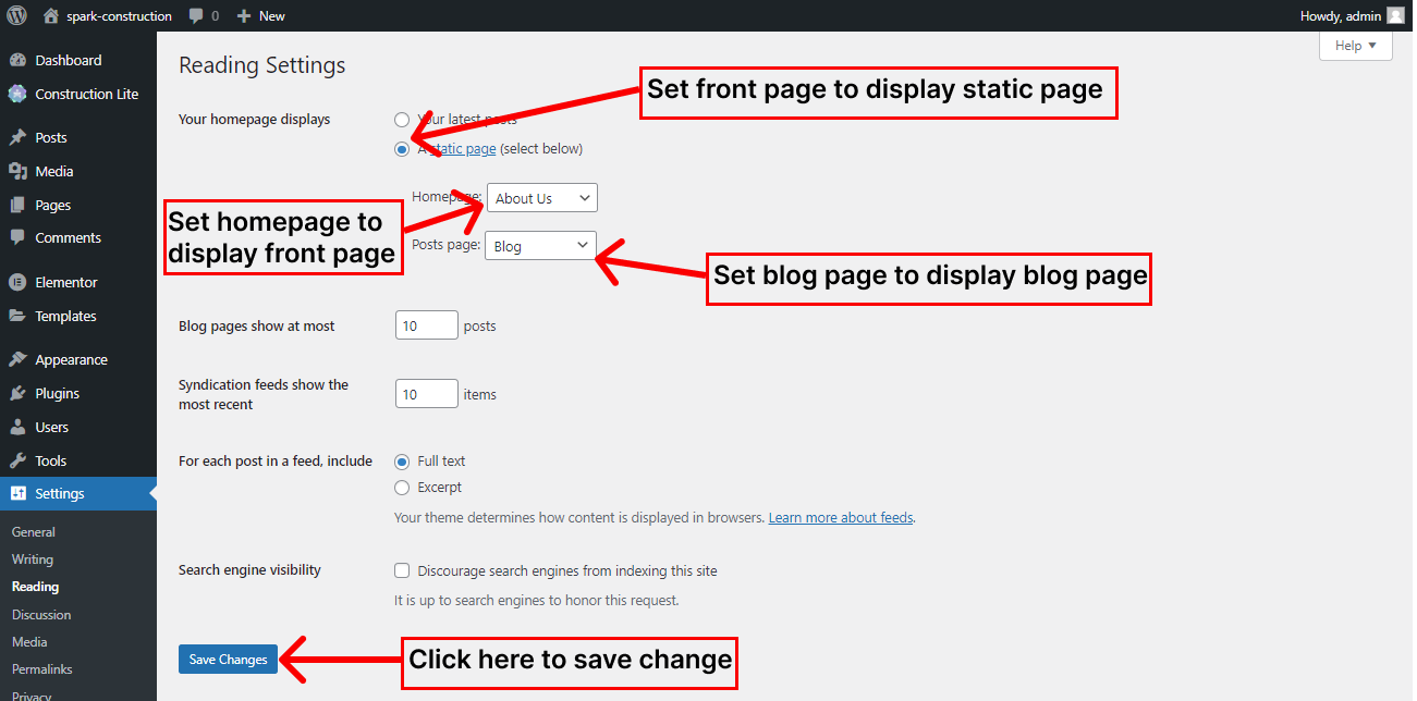 • Now go to Settings > Reading to assign your Elementor homepage.